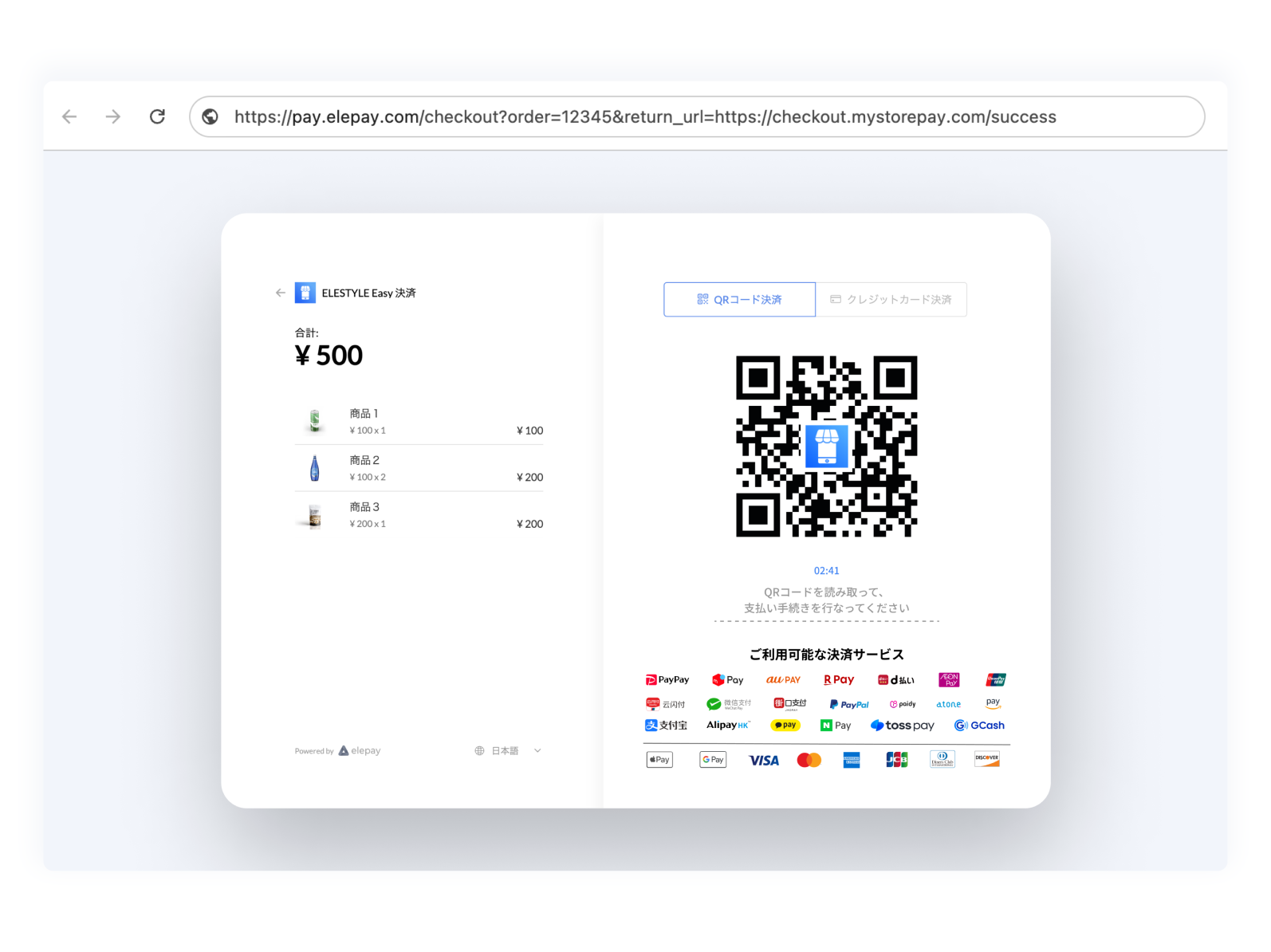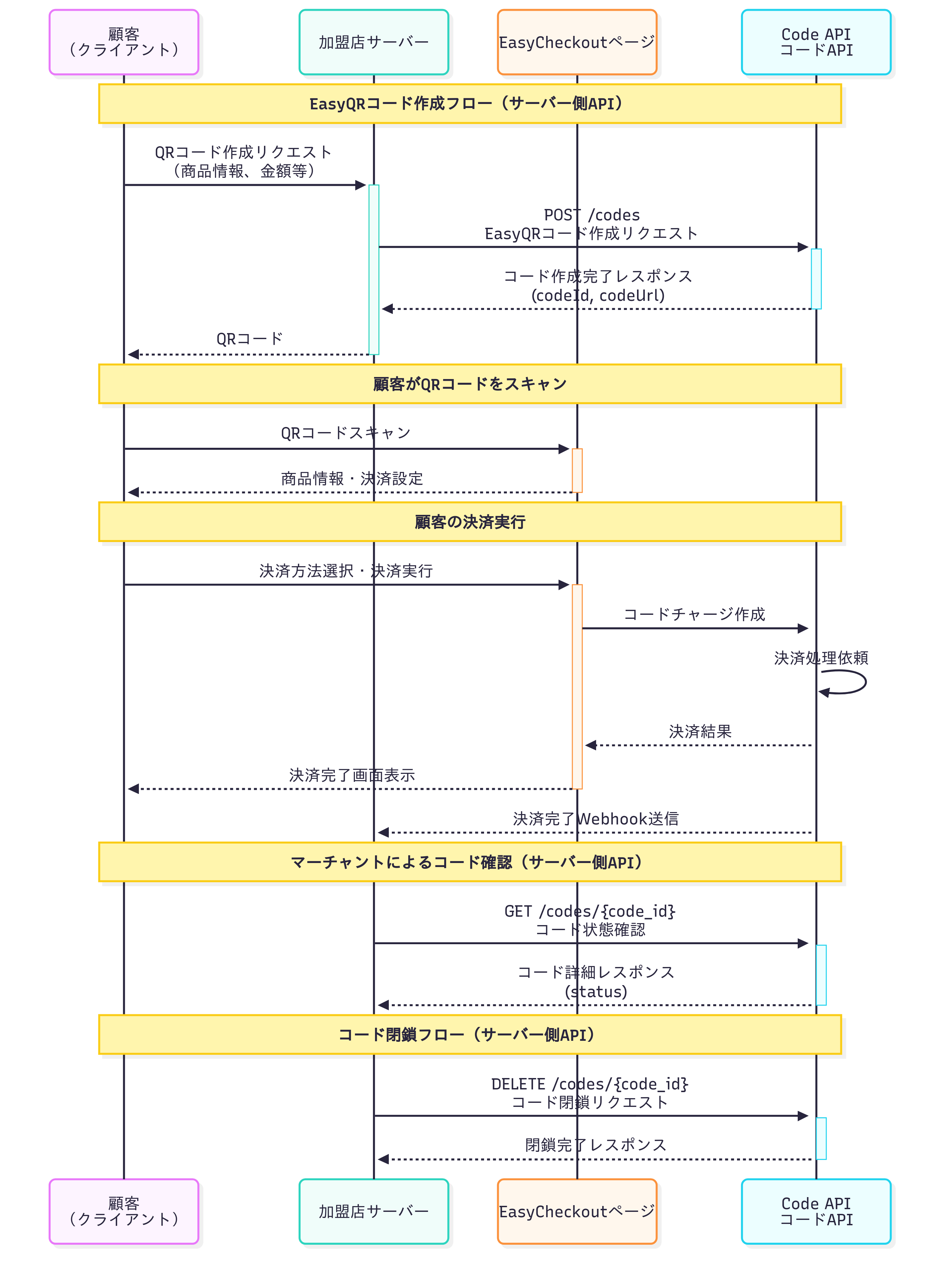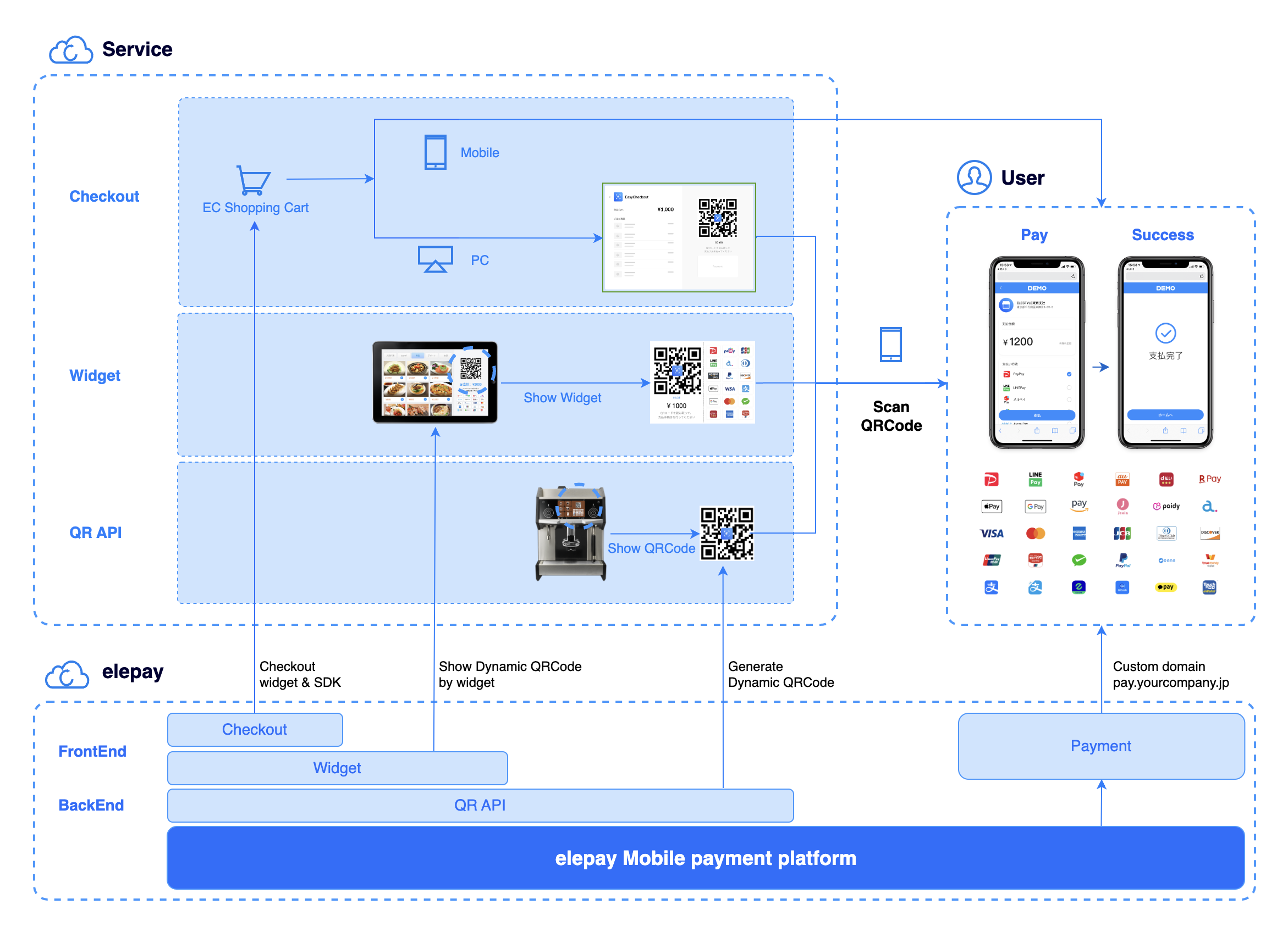 EasyCheckoutはelepayが提供しているMPM型の動的QRコード機能です。主に下記の利用シーンで動的にQRコードを表示し、お客様がQRコードを読み取ってお支払いする利用シーンに使われます。