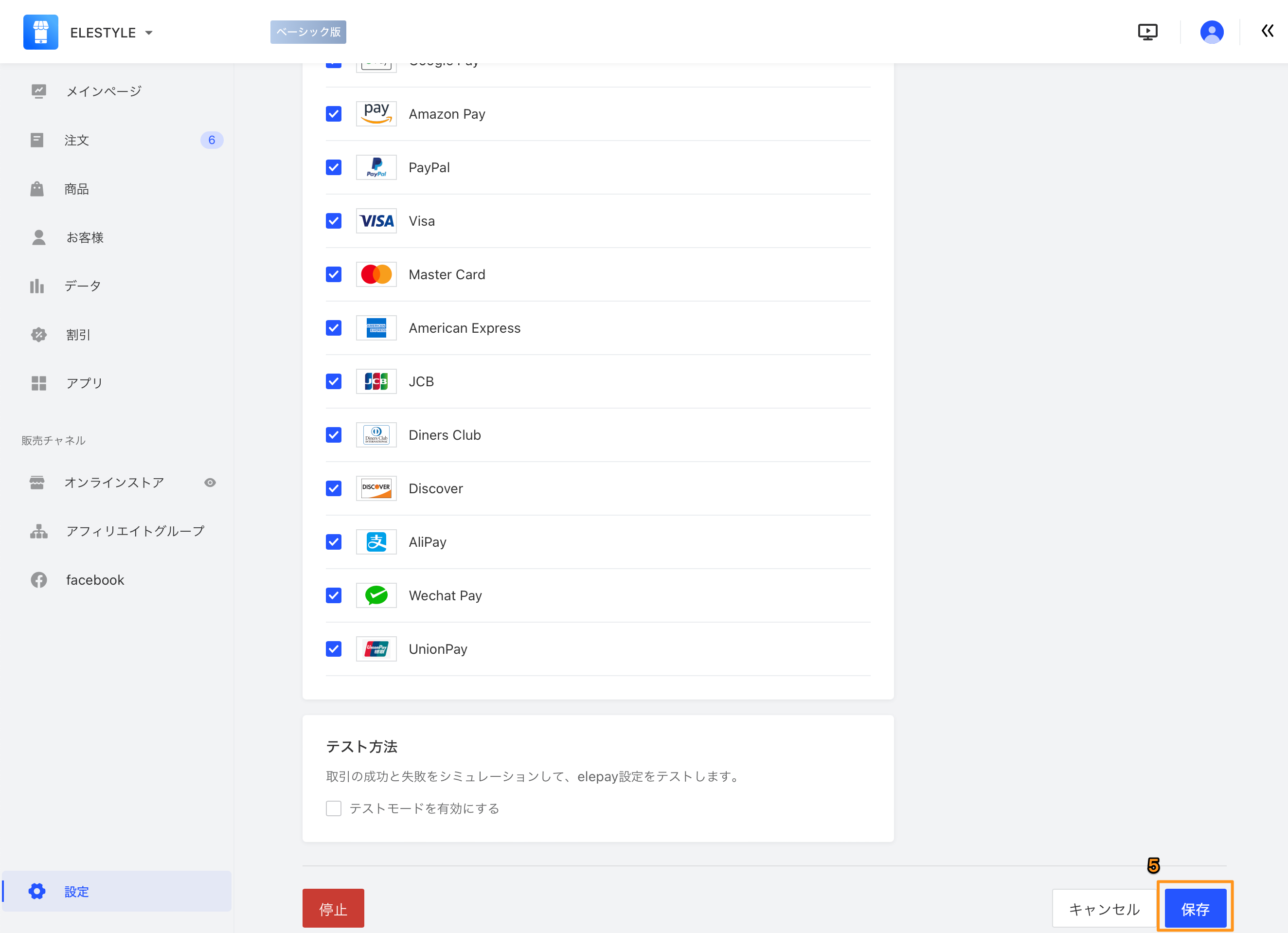 - ユーザーが選択できる決済方法を指定してください。指定が完了しましたら、「保存」ボタンをクリックしてください。