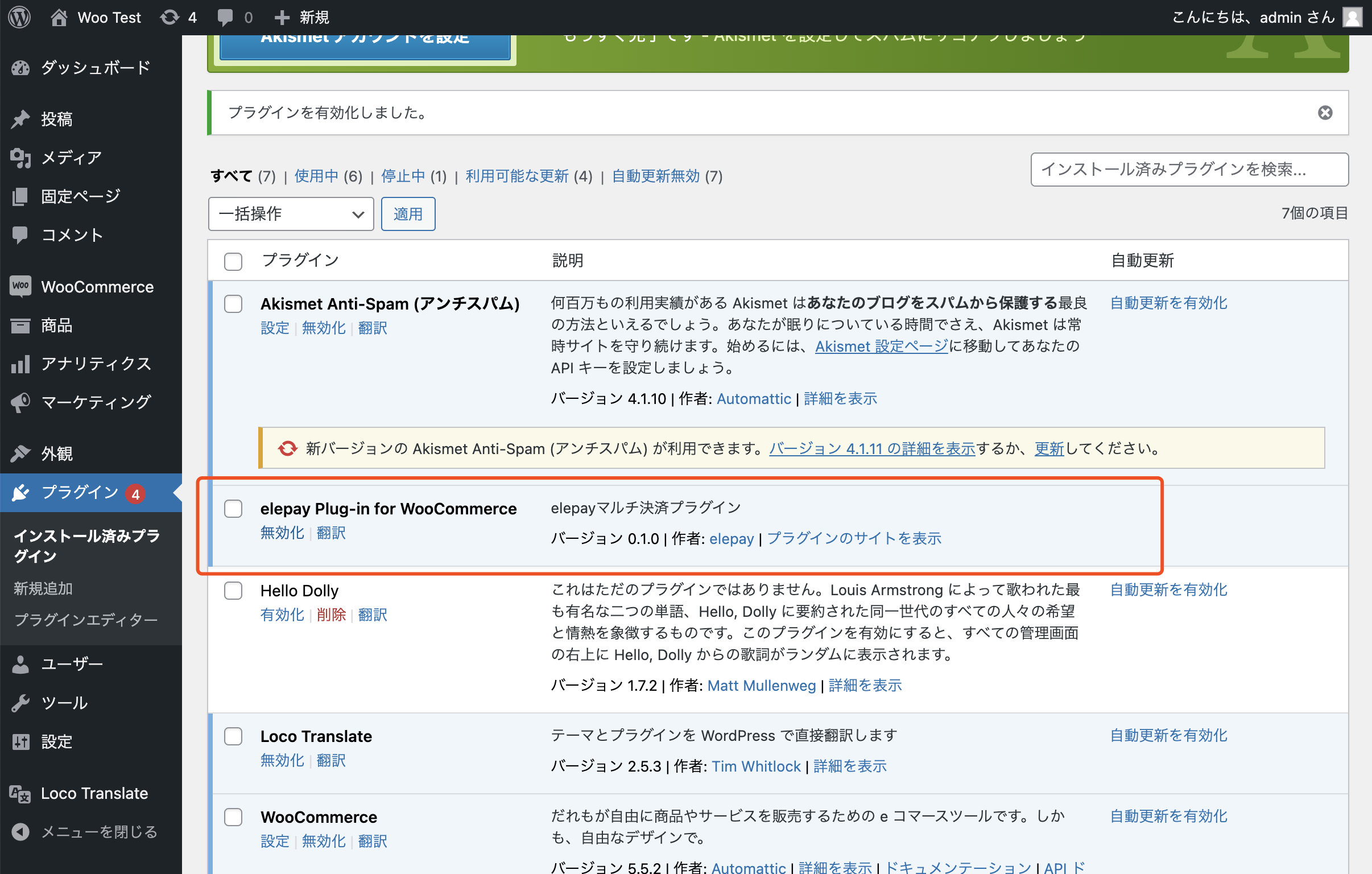 - 「プラグイン」の一覧リストから「elepay Plug-in for WooCommerce」が表示されましたら、利用可能な状態になります。
