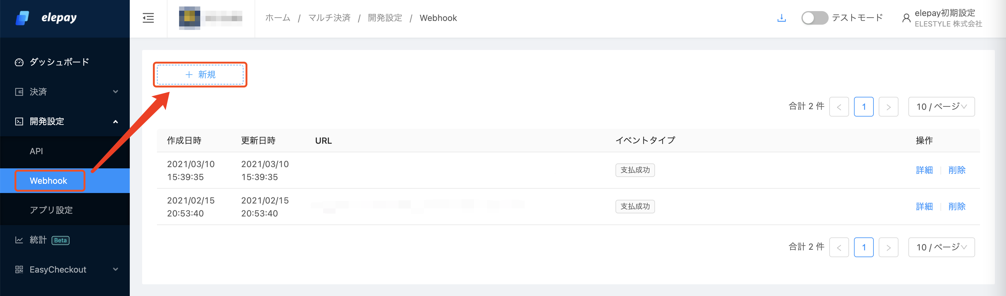 - elepay 管理画面の「開発設定」→「Webhook」にて、「新規」ボタンをクリックしてください。