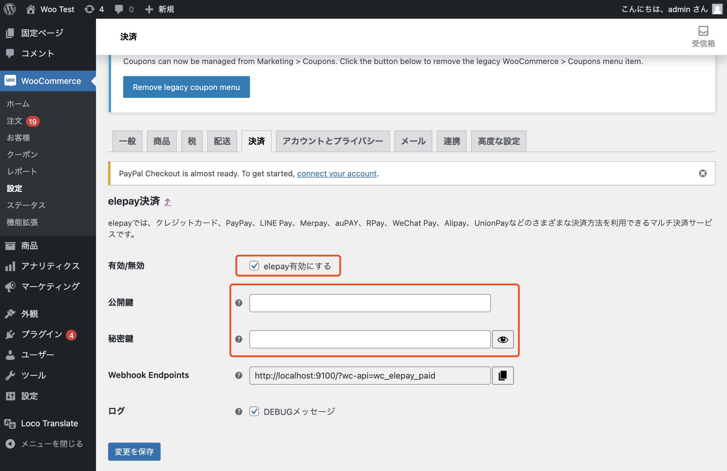 「有効/無効」にて、「elepay有効にする」をチェックして、「公開鍵」と「秘密鍵」に、elepay管理画面から取得した開発キーを入力してください。最後に「変更を保存」ボタンをクリックしてください。