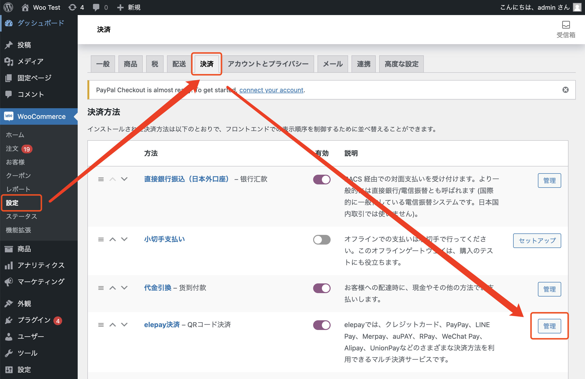 「設定」→「決済」→「elepay決済-QRコード決済」→「管理」をクリックしてください。