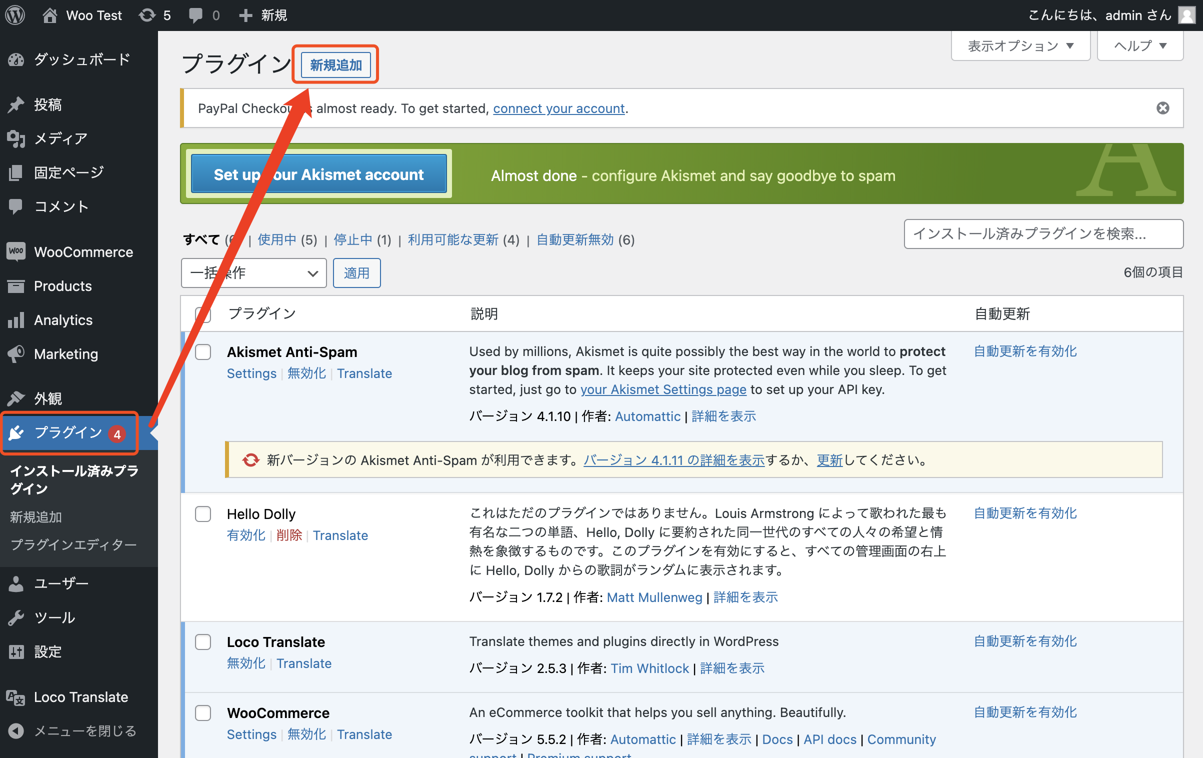 「プラグイン」→「新規追加」ボタンをクリックしてください。