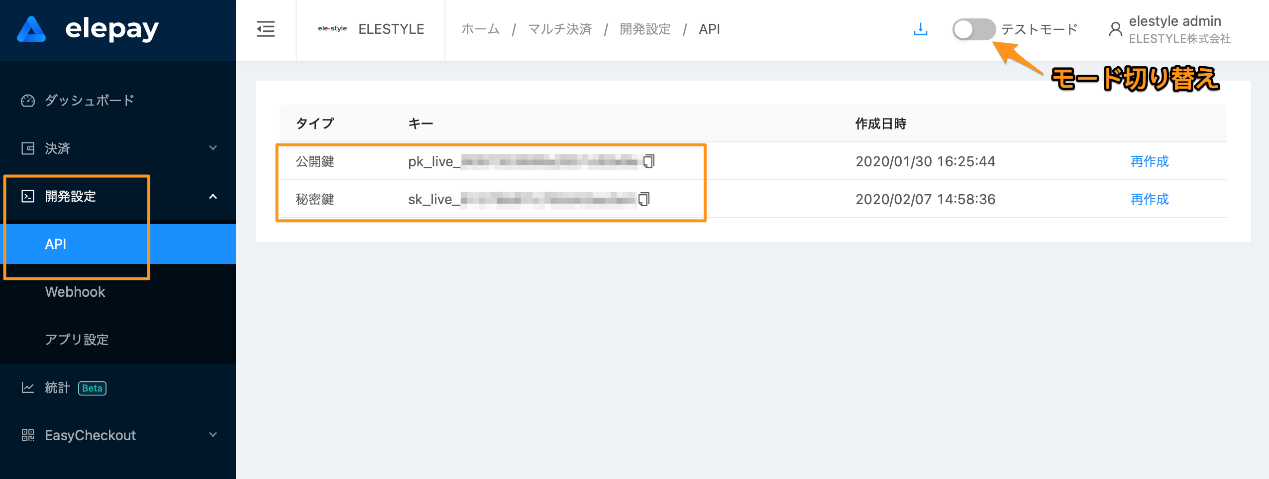 Test モードとLive モードの Key について、elepay 管理画面で管理されています。管理画面左側の「開発設定/ API」をクリックすれば、apiキーを確認できます。
